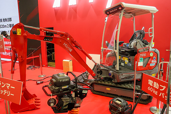 同クラス(1.8t)のディーゼルエンジン式バックホーと同等のパワー、スタミナを誇る電動式バックホー。学校や病院、自治体の敷地内や周辺など、排出ガスと騒音の規制があるエリアでも作業できるのが特長だ。国土交通省により、GX建設機械に認定されている。