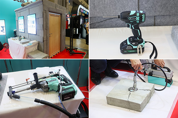 「サイレントシステム工法」は、工事騒音による作業制限を緩和させる工法。改修工事における生産性の向上、労働環境の改善、人手不足の解消をサイレントシステムが実現する。工事騒音(空気伝播音)を約30dB消音させる消音仮設壁「サイウォール」や、「サイドライバー」をはじめとする、打撃による騒音と振動を低減させ、固体伝播音を発生させない消音工具などを展示した。
