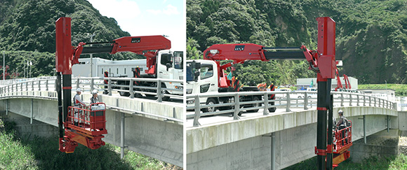BT-300のブームは、車両左側だけではなく、右側にも展開できる。左右展開とも、最大歩道乗り越え幅は3m前後確保可能だ。また、車両右側へブームを展開させることで、一方通行の高速道路や自動車専用道路の追い越し車線側からも桁下へのアプローチが可能になる。