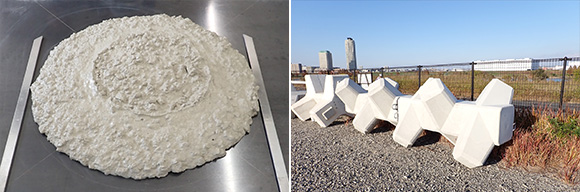 ハイプロダクリートの外観(左)と、物理的な性質変化や劣化、耐久性を調査するための、ハイプロダクリートを使った根固めブロックの暴露試験(画像提供:東京理科大学創域理工学部社会基盤工学科)