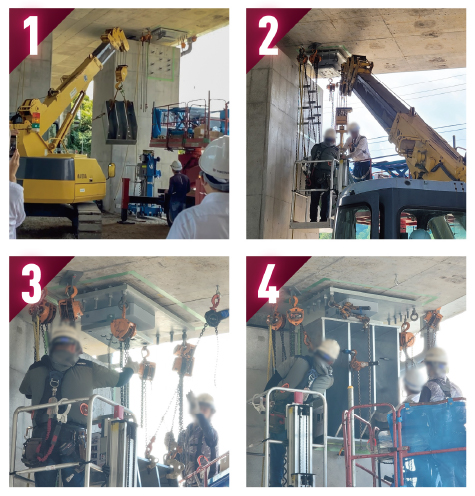 (1)クレーンで持ち上げられる高さまで運搬し、(2)チェーンブロックに盛り替え、(3)人力作業で設置高まで揚重。(4)複数のチェーンブロックを使い、位置調整するなど、人手も時間もかかる作業となる(写真提供:人機一体)