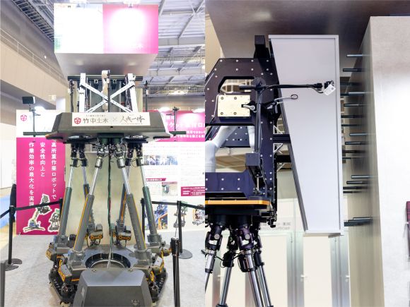 人機一体が開発した「人機スチュワートプラットフォーム ver.2.0」が「ハイウェイテクノフェア2025」の竹中土木のブースにて展示された。遠隔操作によって6本のシリンダが連動し、ブラケットの位置調整・取り付けを行う