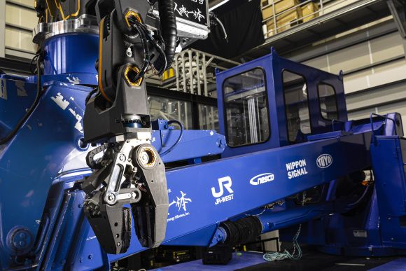 西日本旅客鉄道株式会社、日本信号株式会社、株式会社東洋車輛、人機一体が開発した工事車両一体型人型ロボット「零式人機 ver.2.0」。鉄道工事用車両に人型ロボットを搭載し、高所で人間が作業していた多様な設備メンテナンスに対応するPoC試作機(写真提供:JR西日本)