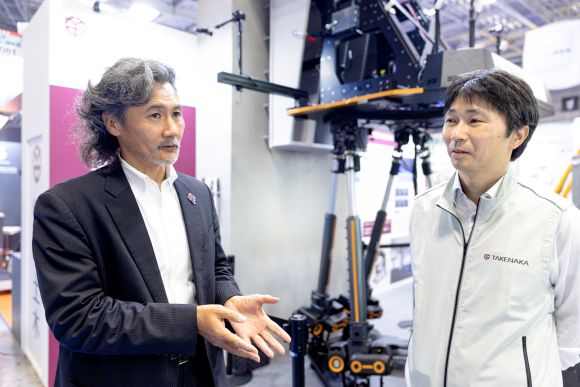 「ハイウェイテクノフェア2025」にて、竹中土木の担当者と実証試作機について話す